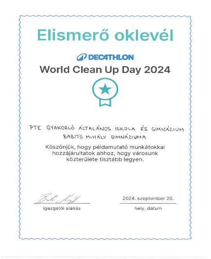 2024. szeptember 20-án 60 tanulónkkal csatlakoztunk a „World Clean Up Day” elnevezésű nemzetközi kezdeményezéshez a Decathlon támogatásával. A program célja az iskolai környezet tudatos rendben tartása: szemétszedés az iskolaudvaron, az épület környékén.