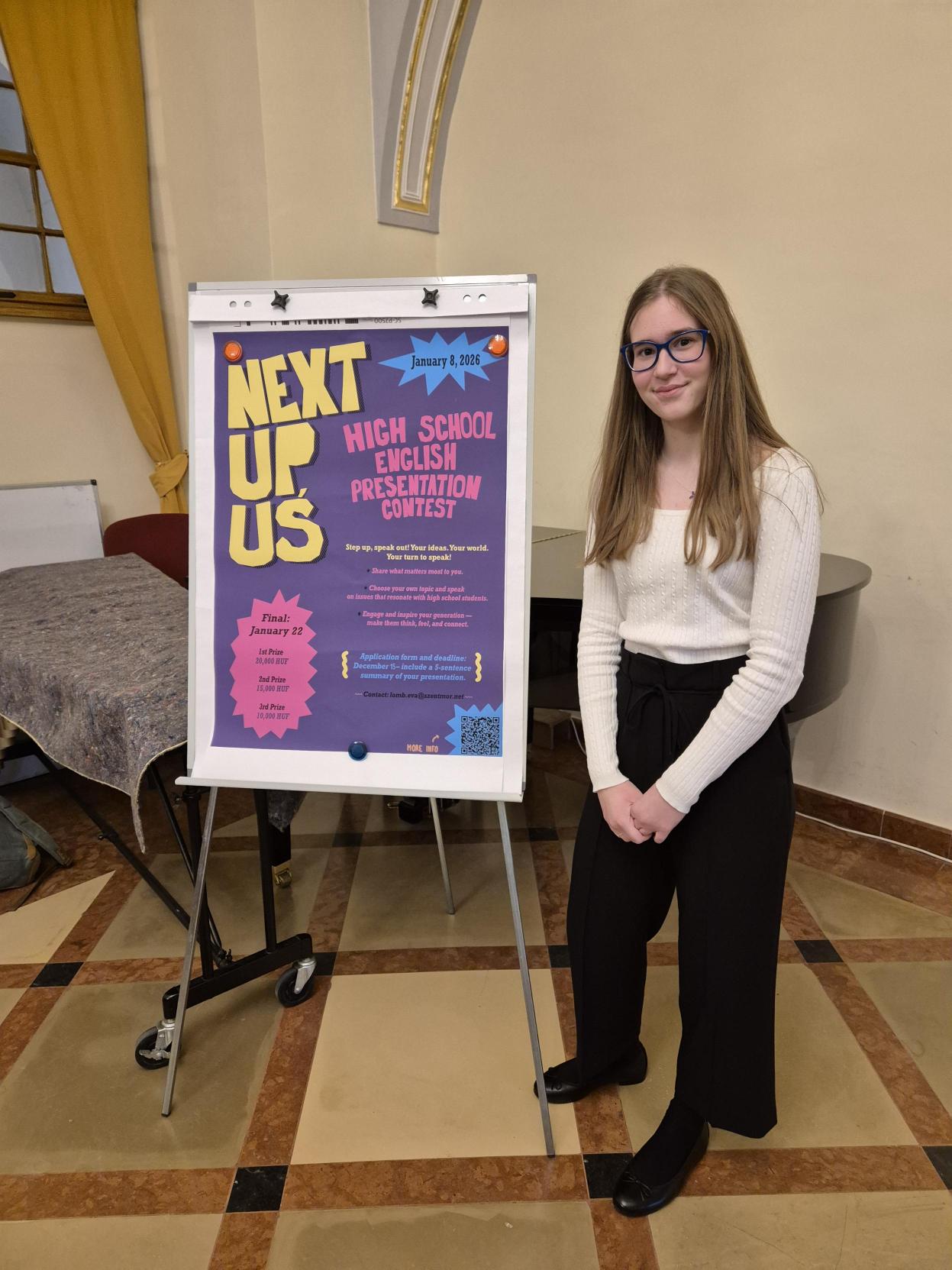 Molnár Gréta, a 10.D osztály tanulója második helyezést ért el a Next Up Us című városi prezentációs versenyen, amelyet a Szent Mór Katolikus Gimnáziumban rendeztek meg. A megmérettetésen a résztvevő fiatalok számukra releváns, aktuális témákról tartottak előadást."
