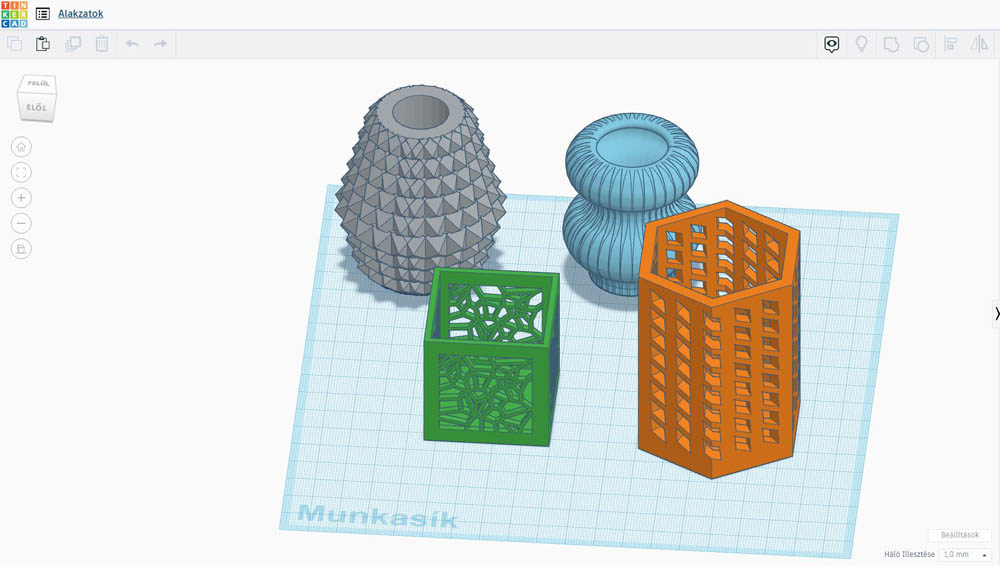 Az egyszerűbb modellekhez a TinkerCad nevezetű webes modellező és tervező programmal készítettünk egyedi mintázatú írószertartókat és vázákat.